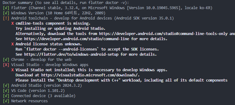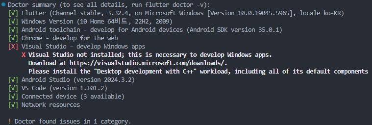 설치가 완료되면 flutter doctor에서 관련 오류가 사라진다.