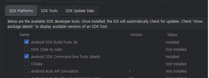 Android SDK Command-line Tools (latest) 체크 후 Apply